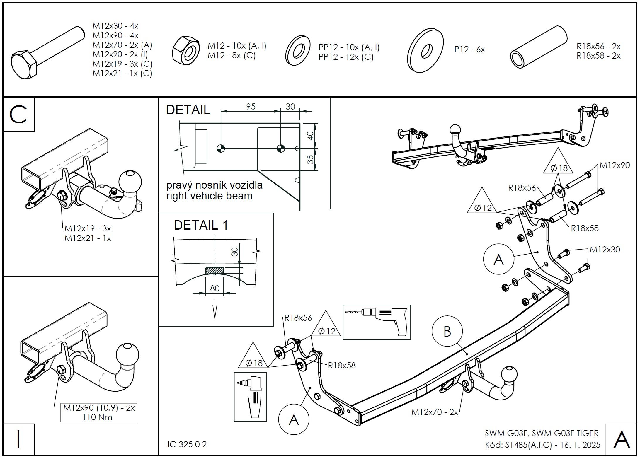 • Ťažnú guľu (podľa zvoleného typu – pevná skrutková alebo odnímateľná/bajonetová).